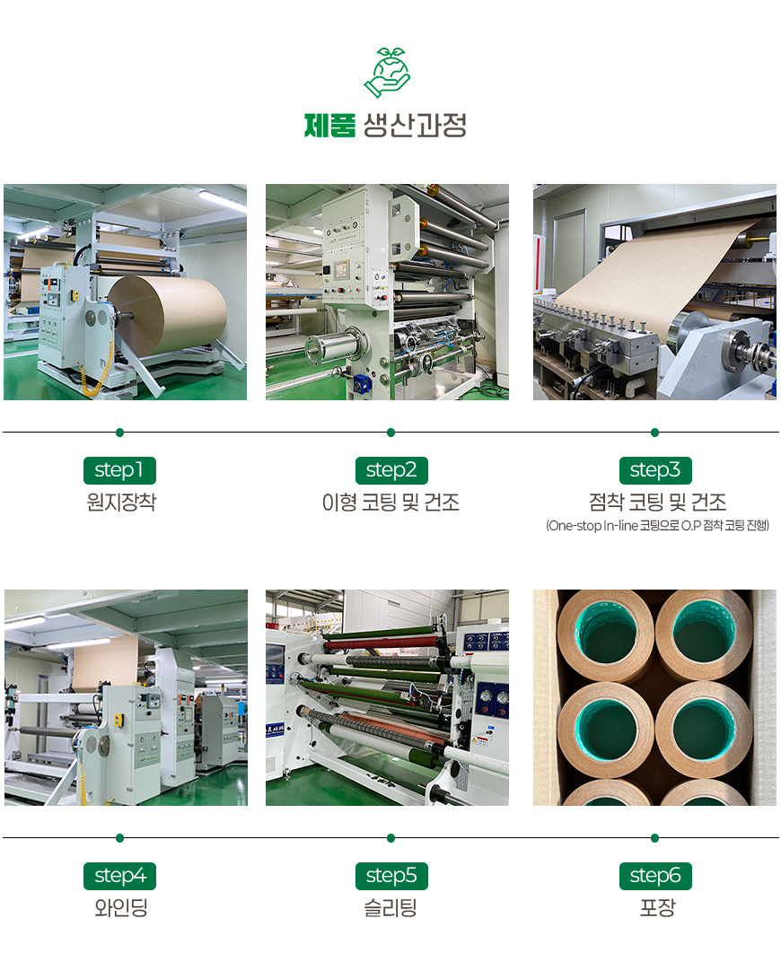 - 고품질 종이 소재 (All Pulp): 재생지가 아닌 고순도 천연 펄프만을 사용하여 포장에 요구되는 높은 인장강도를 구현. 시중 종이테이프에 대비하여 우수한 강도와 내구성 확보.