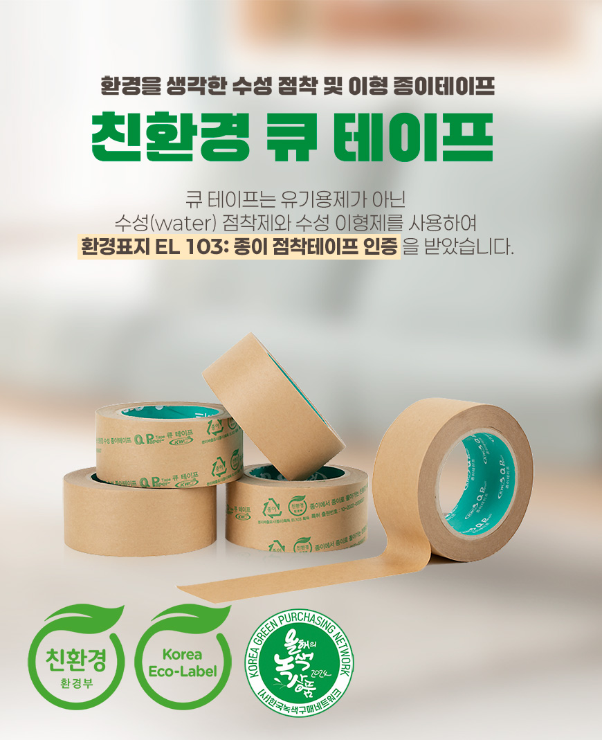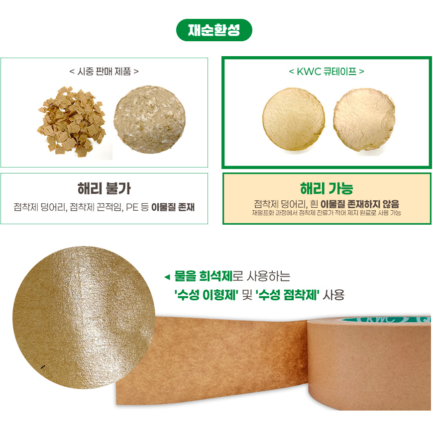 KWC 종이테이프는 접착층에 친환경 수성 점착제를 사용한 제품으로, 환경부 환경표지 인증(EL103: 종이 접착테이프 및 종이 접착시트)을 획득했다. 일반 OPP 테이프나 합성수지 함침지, 유성 종이테이프와 달리 KWC 종이테이프는 다음과 같은 특성을 지닌다.
