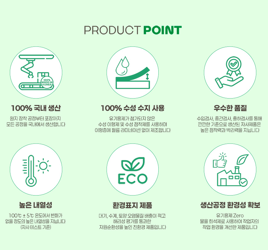 - 無유기용제·無중금속 설계: 수성 접착을 적용하고, 납·카드뮴 등 중금속 성분을 배제하여 생산 및 폐기 단계에서 유해물질 발생 없음