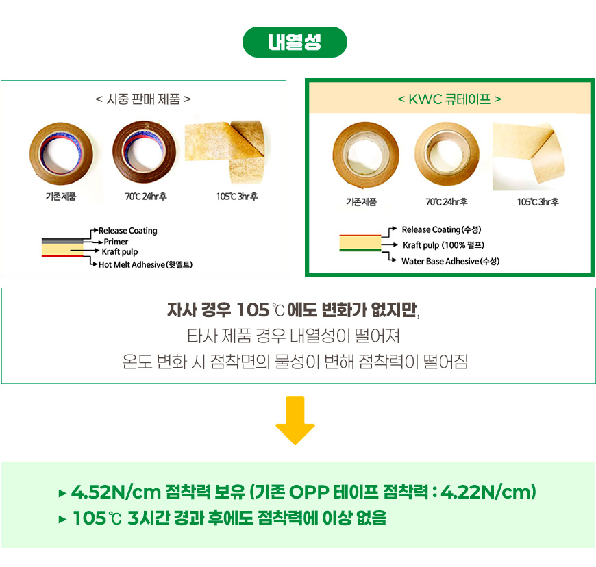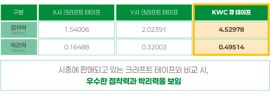 KWC 종이 테이프는 시중 OPP 테이프 평균 (2.76 N/㎠) 대비 약 63% 높고, 시중 종이테이프 평균 (3.55 N/㎠) 대비 약 27% 높은 4.5 N/㎠ 점착력 지님