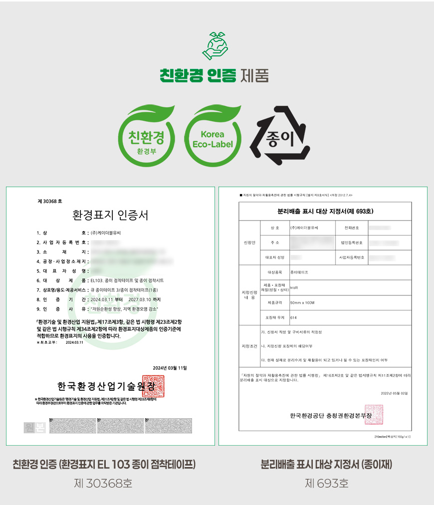 - 친환경 인증 확보: UL ECV 2485, 한국환경산업기술원 친환경 환경표지 인증(제30368호), 종이 분리배출 지정서(제693호) 획득