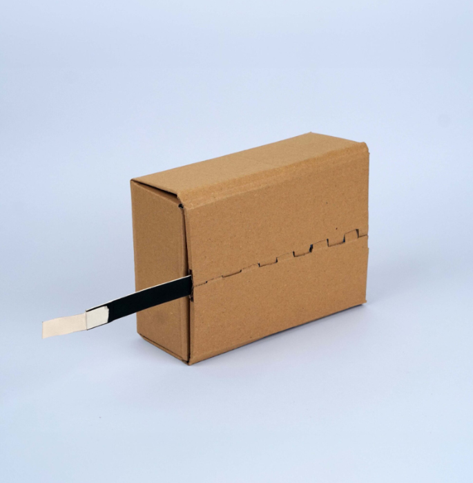 이 상자는 나무 쐐기와 골판지 구멍을 이용하여 특허 받은 모노집 잠금 장치를 갖추고 있다. 2초 이내에 열고, 5초 만에 닫고, 100번 이상 다시 밀봉할 수 있으며, 테이프와 달리 골판지가 손상되지 않는다.