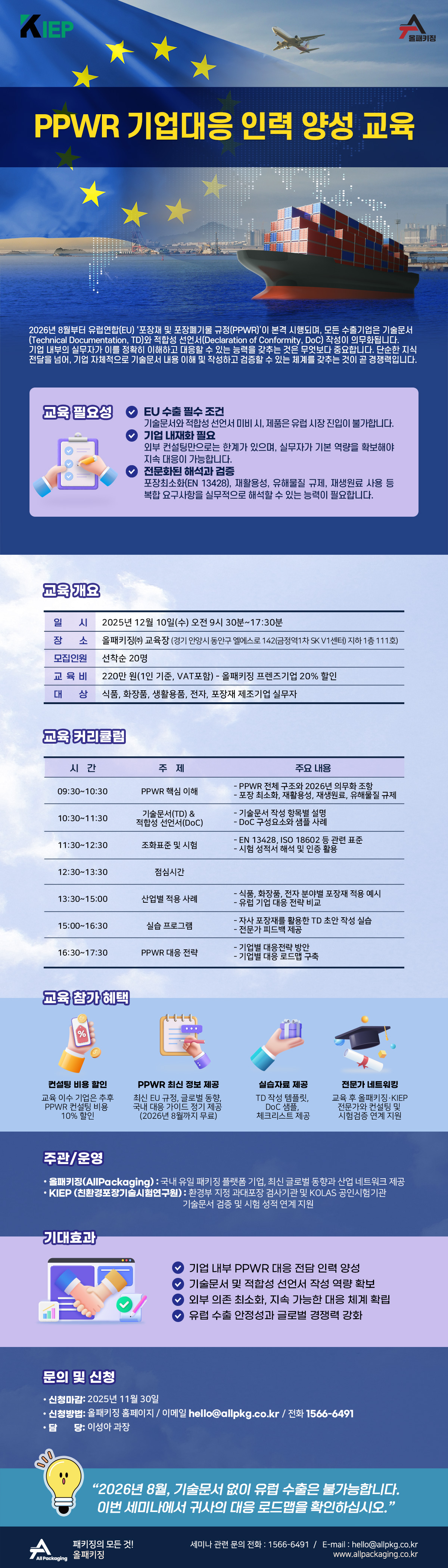 이를 통해 기업은 내부 PPWR 대응 전담 인력을 확보하고, 기술문서 및 적합성 선언서 작성 역량을 강화할 수 있습니다. 또한 외부 의존을 최소화한 지속 가능한 대응 체계를 구축함으로써, 유럽 수출의 안정성과 글로벌 경쟁력을 한층 높일 수 있습니다.