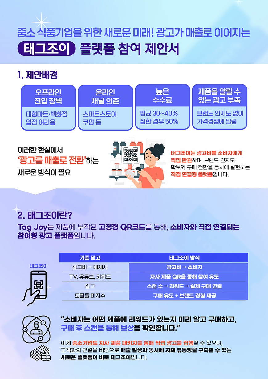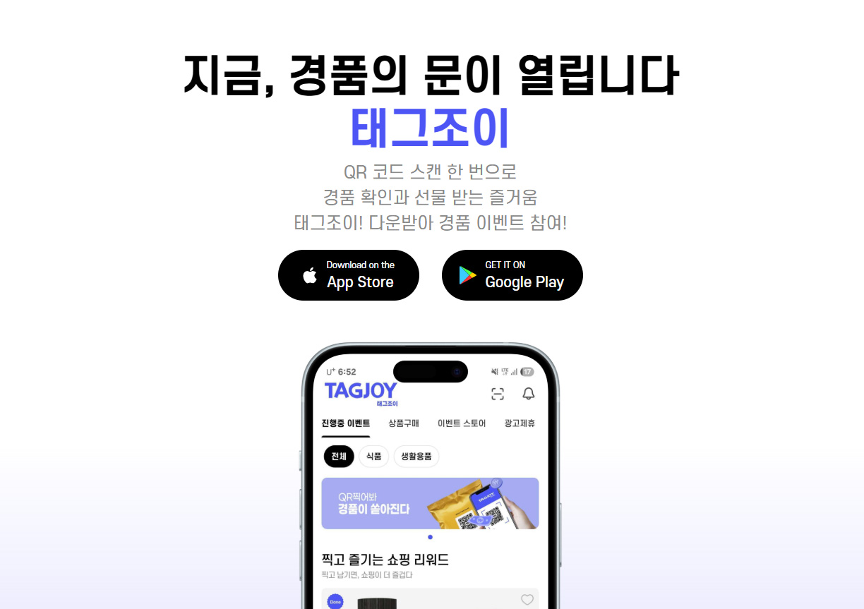 태그조이 광고(TagJoy)는 패키지에 삽입된 QR을 통해 소비자가 직접 스캔하고 참여하며 보상을 받는 리워드형 참여 광고 플랫폼입니다.